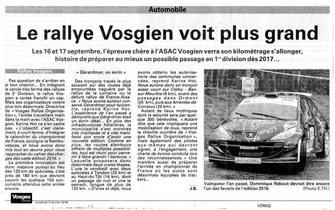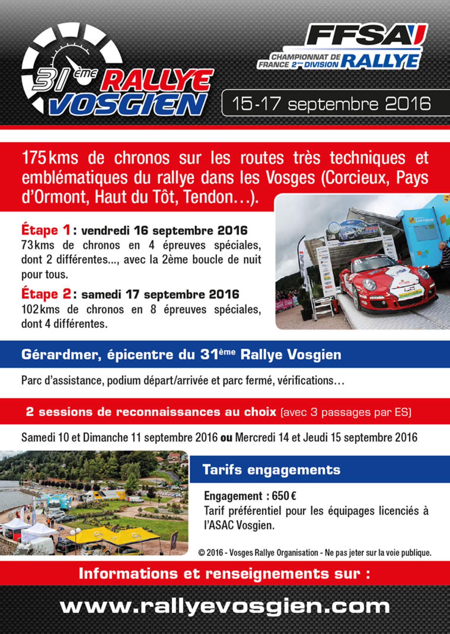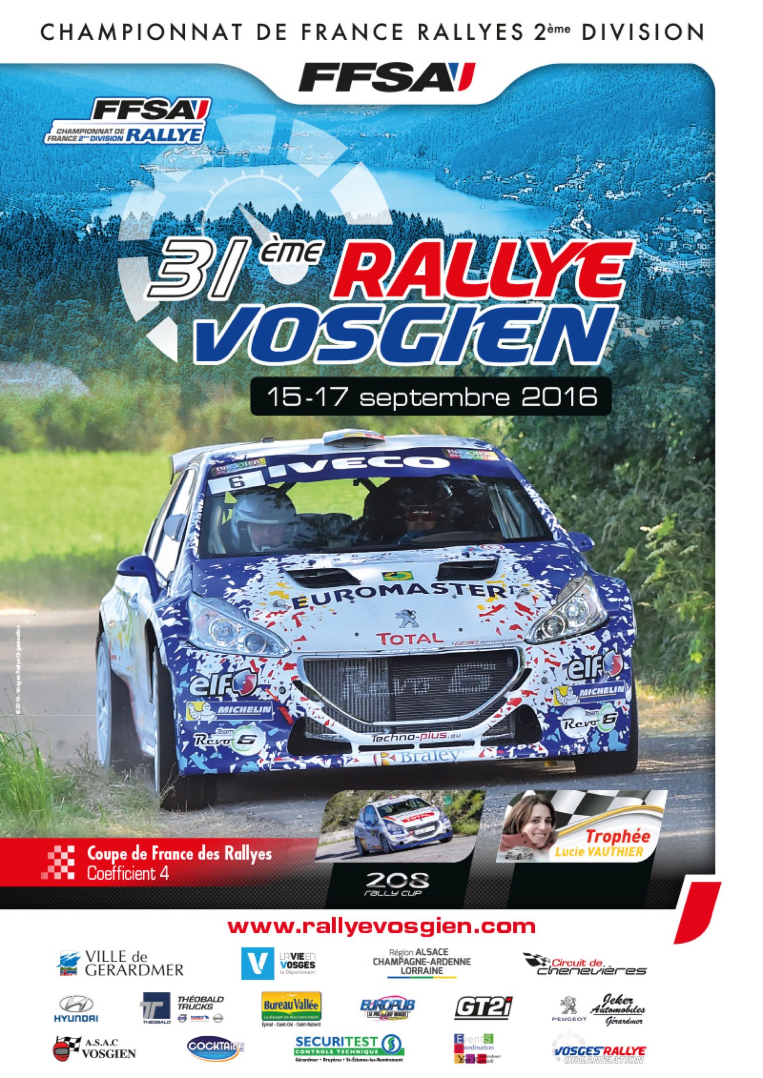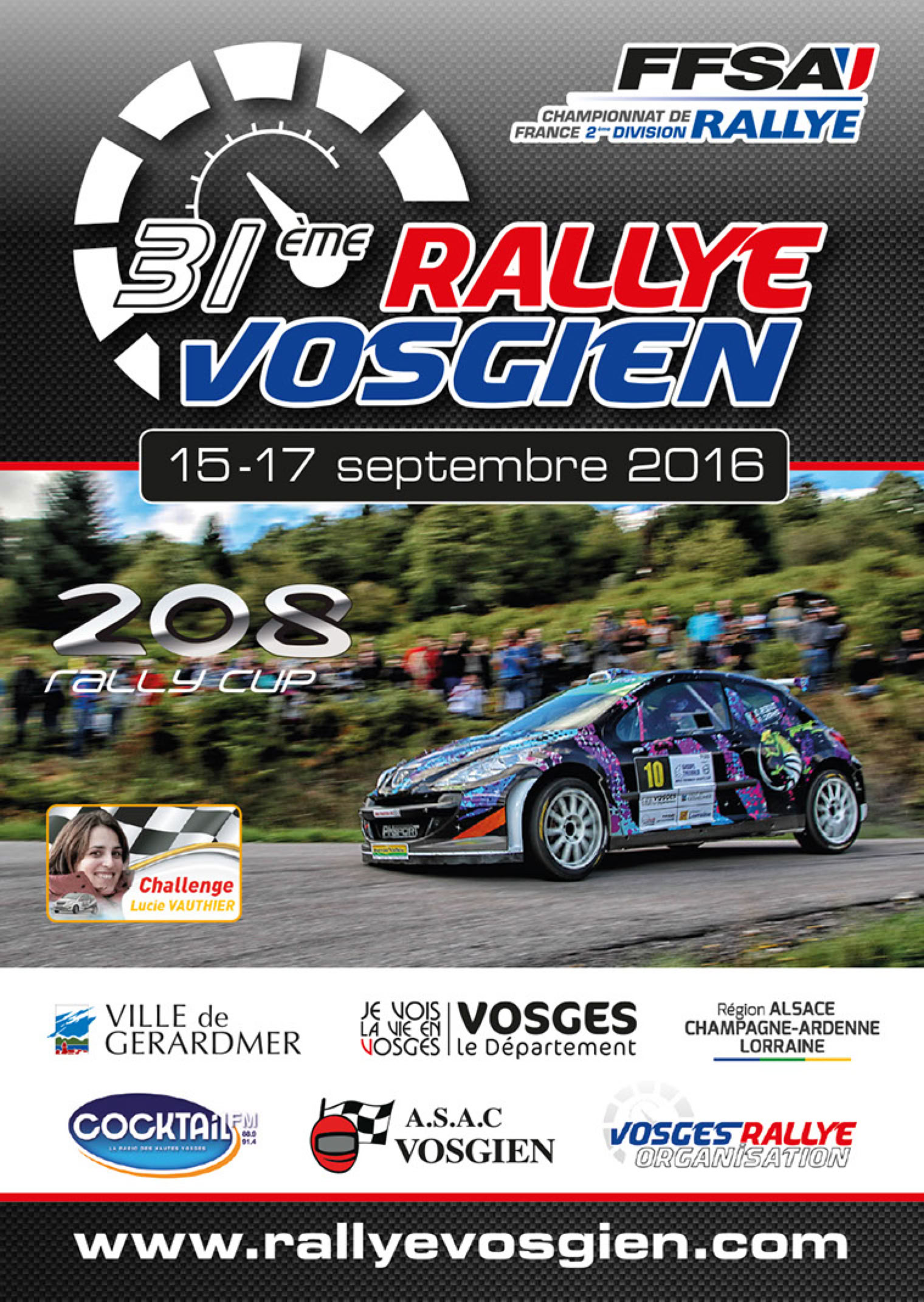 Après avoir accueilli de grands noms du sport automobile lors des précédentes éditions, venus tour à tour préparer le Rallye de France - Alsace WRC, et avoir réussi son passage en Championnat de France des Rallyes 2ème Division en 2015, le Rallye Vosgien a tenu toutes ses promesses pour sa 31ème édition : un magnifique environnement, un parcours très technique sur des routes mythiques, un plateau pilote de qualité, la participation très remarquée de la Peugeot 208 Rally Cup…