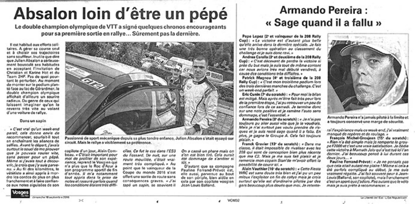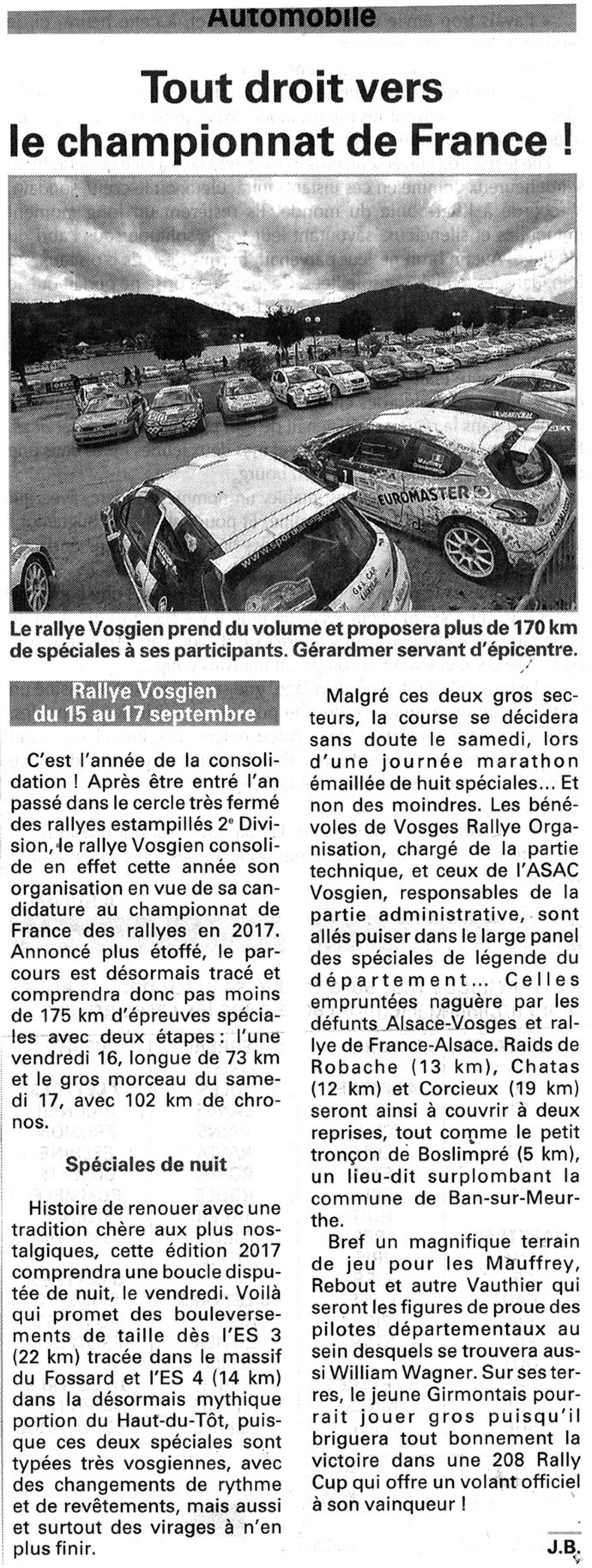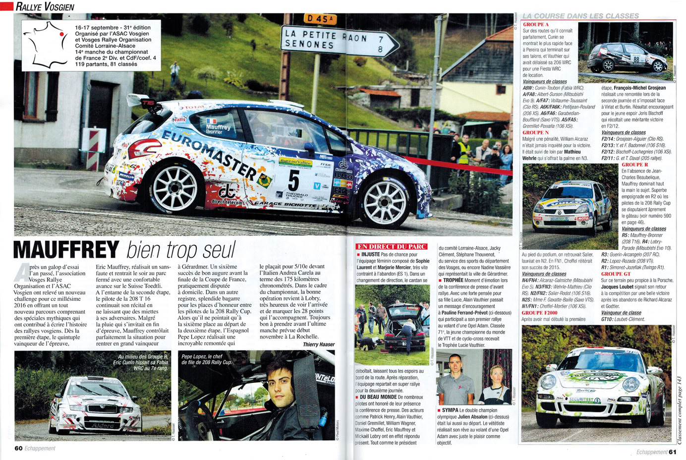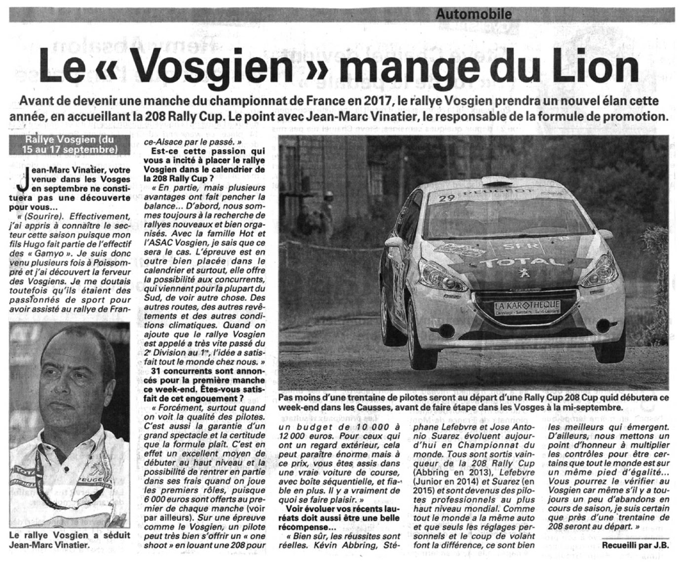 Après avoir accueilli de grands noms du sport automobile lors des précédentes éditions, venus tour à tour préparer le Rallye de France - Alsace WRC, et avoir réussi son passage en Championnat de France des Rallyes 2ème Division en 2015, le Rallye Vosgien a tenu toutes ses promesses pour sa 31ème édition : un magnifique environnement, un parcours très technique sur des routes mythiques, un plateau pilote de qualité, la participation très remarquée de la Peugeot 208 Rally Cup…