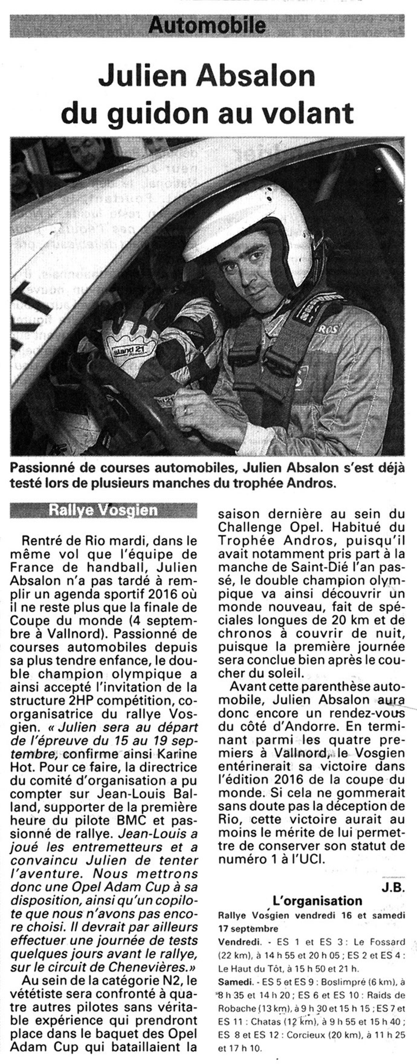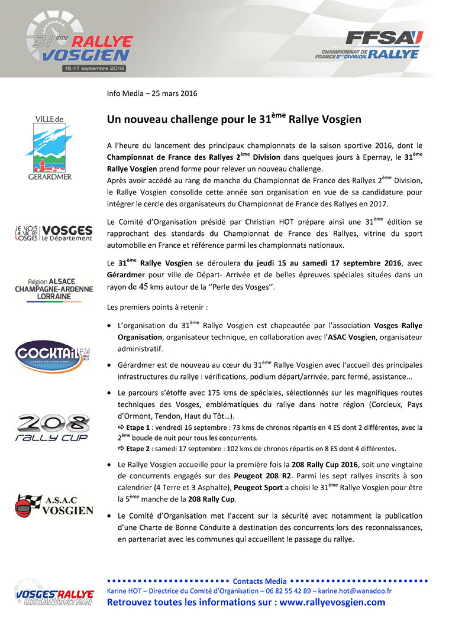 Après avoir fait une entrée remarquée dans le Championnat de France des Rallyes 2ème Division en 2015, le Rallye Vosgien tentera de poursuivre cette année son ascension vers le plus haut niveau. Avec un plateau doté de près de 130 engagés, un duel très attendu en Championnat 2ème Division entre les deux premiers, Mickaël Lobry et Jean-Charles Beaubelique, une lutte sans merci entre les dix-sept équipages de la 208 Rally Cup ou encore la grande première de Julien Absalon, véritable star locale, et de Pauline Ferrand-Prévot, cette 31ème édition promet du grand spectacle ! Et le cadre idyllique de la «Perle des Vosges», Gérardmer, centre névralgique de l’épreuve, et ses célèbres spéciales, ne pourront qu’embellir ce millésime 2016 !