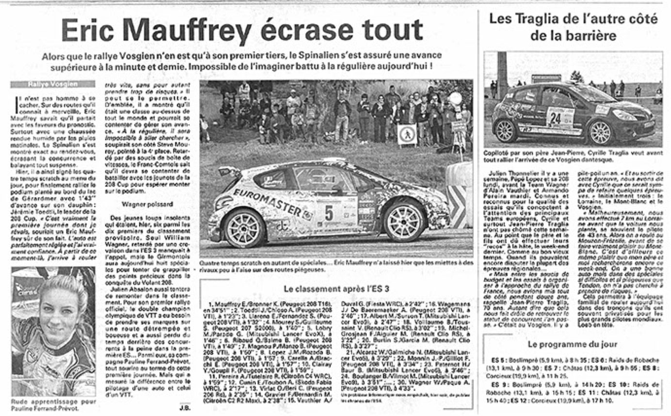 • Placé légitimement parmi les favoris, Eric Mauffrey (Peugeot 208 T16) n’a pas fait dans le détail ! Quatre scratchs en quatre spéciales et déjà plus d’une minute et tente secondes d’avance pour le spinalien !