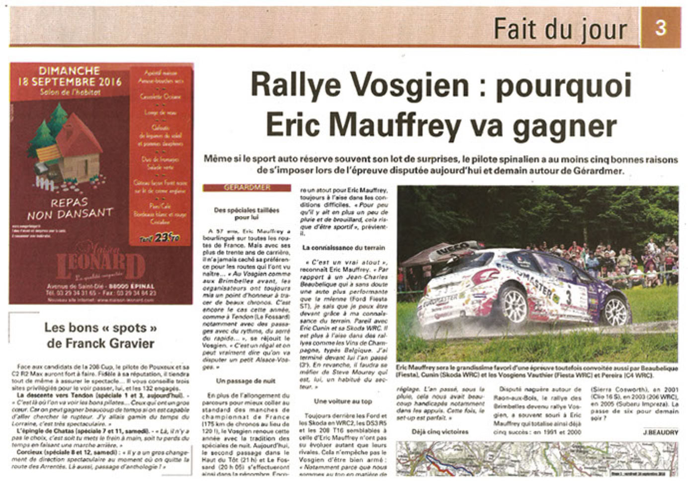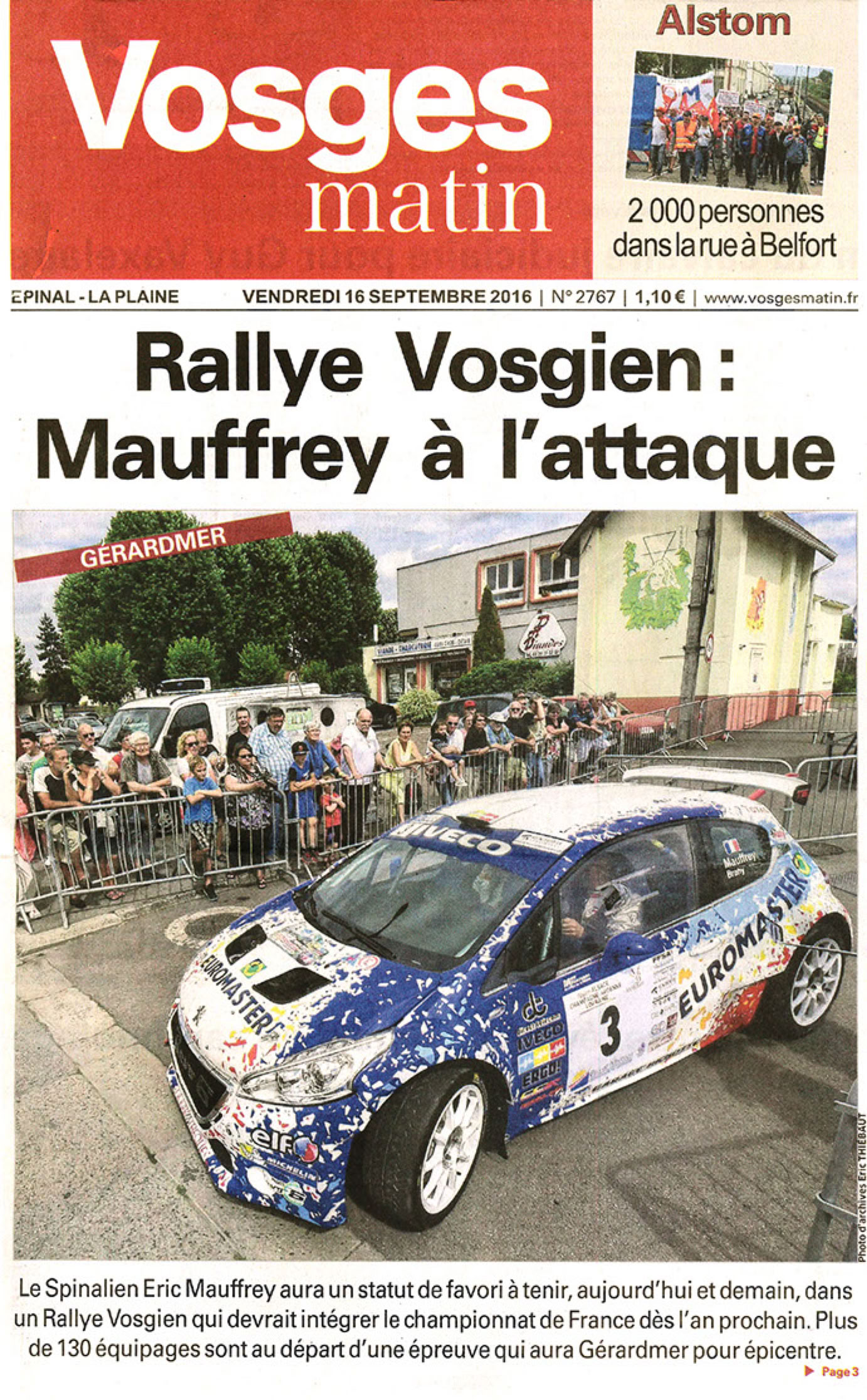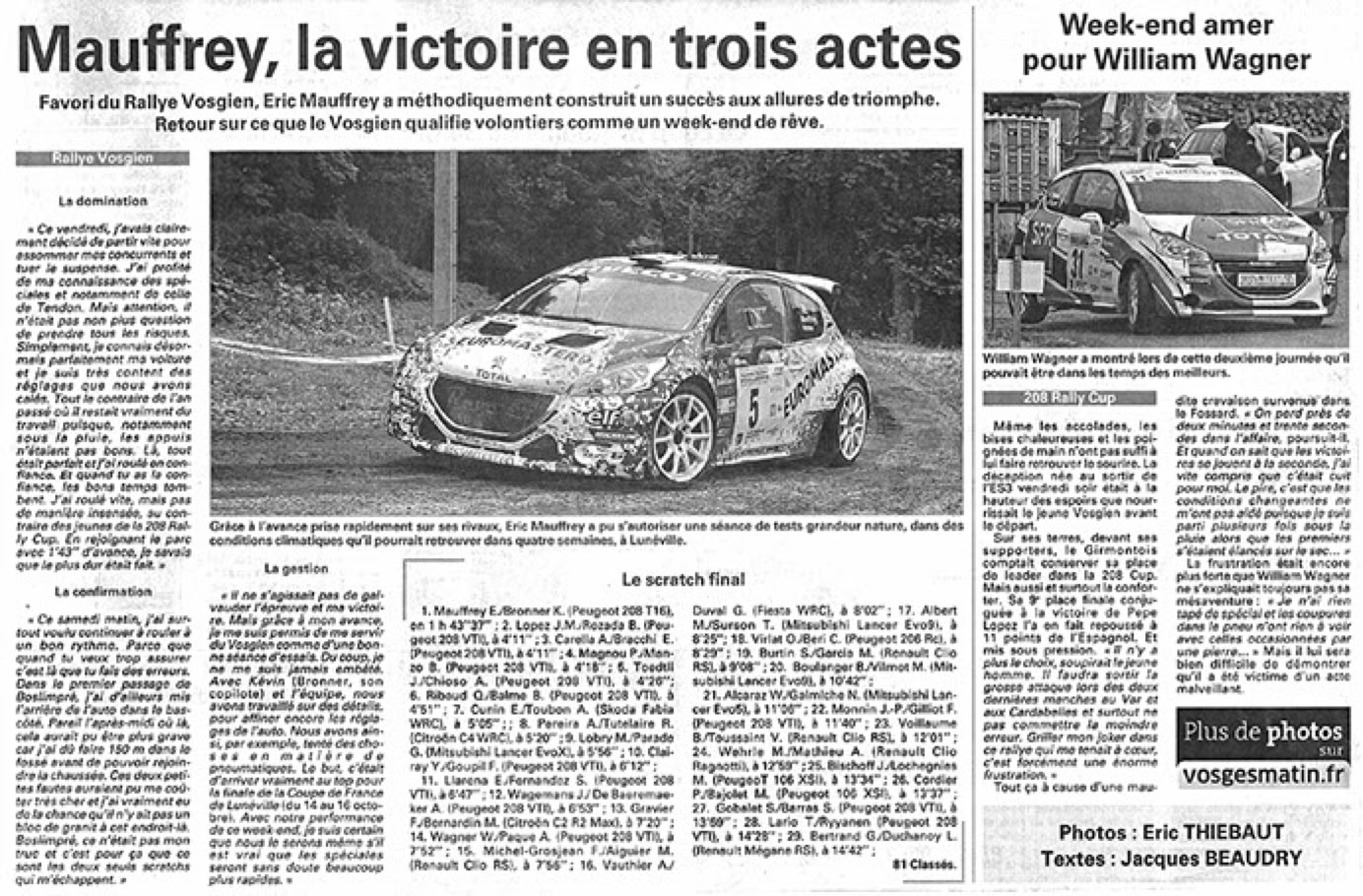 • Dès les premiers kilomètres, Eric Mauffrey (Peugeot 208 T16) prenait le commandement de l’épreuve avec autorité et ne laissait que des miettes à ses adversaires durant les deux jours de compétition ! Le Spinalien décrochait une sixième victoire sur le «Vosgien» sans aucune contestation possible et préparait sa prochaine échéance, la Finale de la Coupe de France des Rallyes qui se tiendra à Lunéville, de la meilleure des façons !